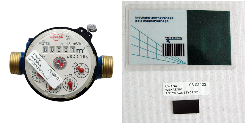 Wskaźnik pola magnetycznego to dwuskładnikowy element pozwalający w łatwy sposób na wykrycie niepożądanego działania polem magnetycznym, np. magnesem neodymowym. Pierwszym elementem jest wskaźnik działania, czyli element o odpowiedniej strukturze ułożenia domen magnetycznych, który jest zabezpieczony numerowaną naklejką (opcjonalnie do wykonania z logo inwestora). Drugim elementem jest klisza kontrolna umożliwiająca sprawdzenie stanu wskaźnika i porównanie ułożenia domen ze stanem wzorcowym pokazanym na kliszy. Wskaźnik montowany jest najczęściej na obudowie liczydła w miejscu łatwo dostępnym dla inkasenta a sama klisza zajmuje tyle miejsca co karta kredytowa czy prawo jazdy.